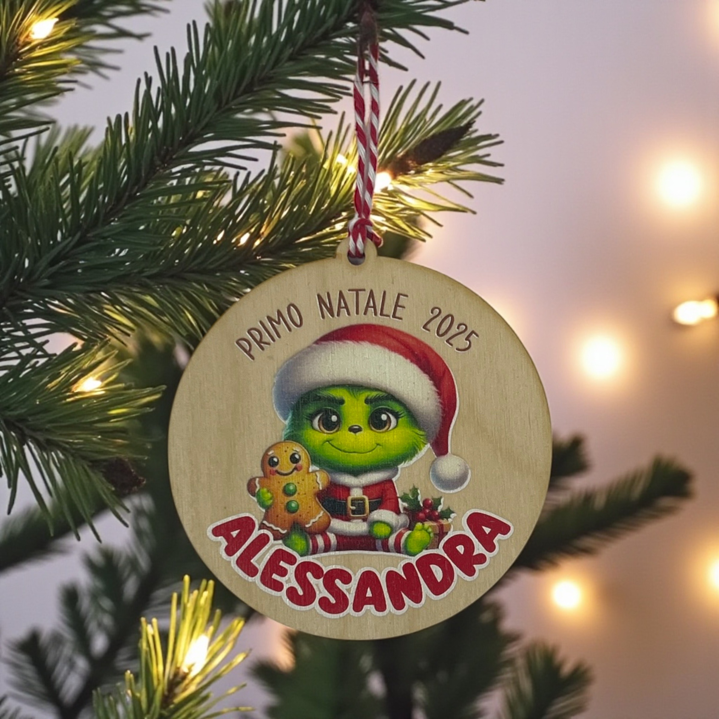 Nuova decorazione natalizia! Decorazioni albero di Natale Grinch in legno di betulla incise con una tenerissima immagine di un baby Grinch e il nome del tuo bambino. Il tutto abbellito con un nastro natalizio bianco e rosso.