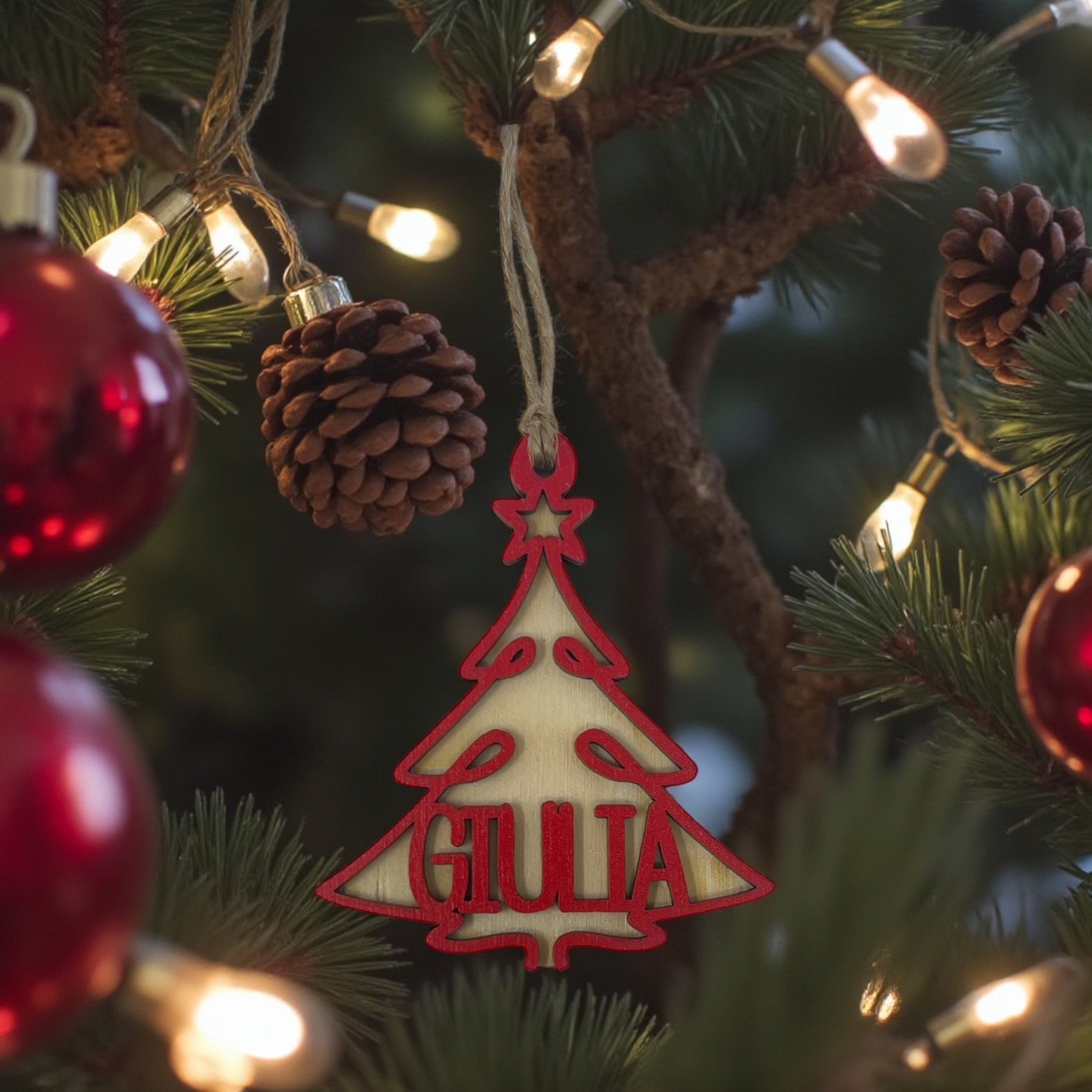 Adorabile decorazione natalizia personalizzata a forma di albero con il tuo nome! Decorazione da appendere all’albero di Natale in legno stampato doppio strato in perfetto stile natalizio. Decora il tuo albero di Natale con una pallina ad effetto Wow!