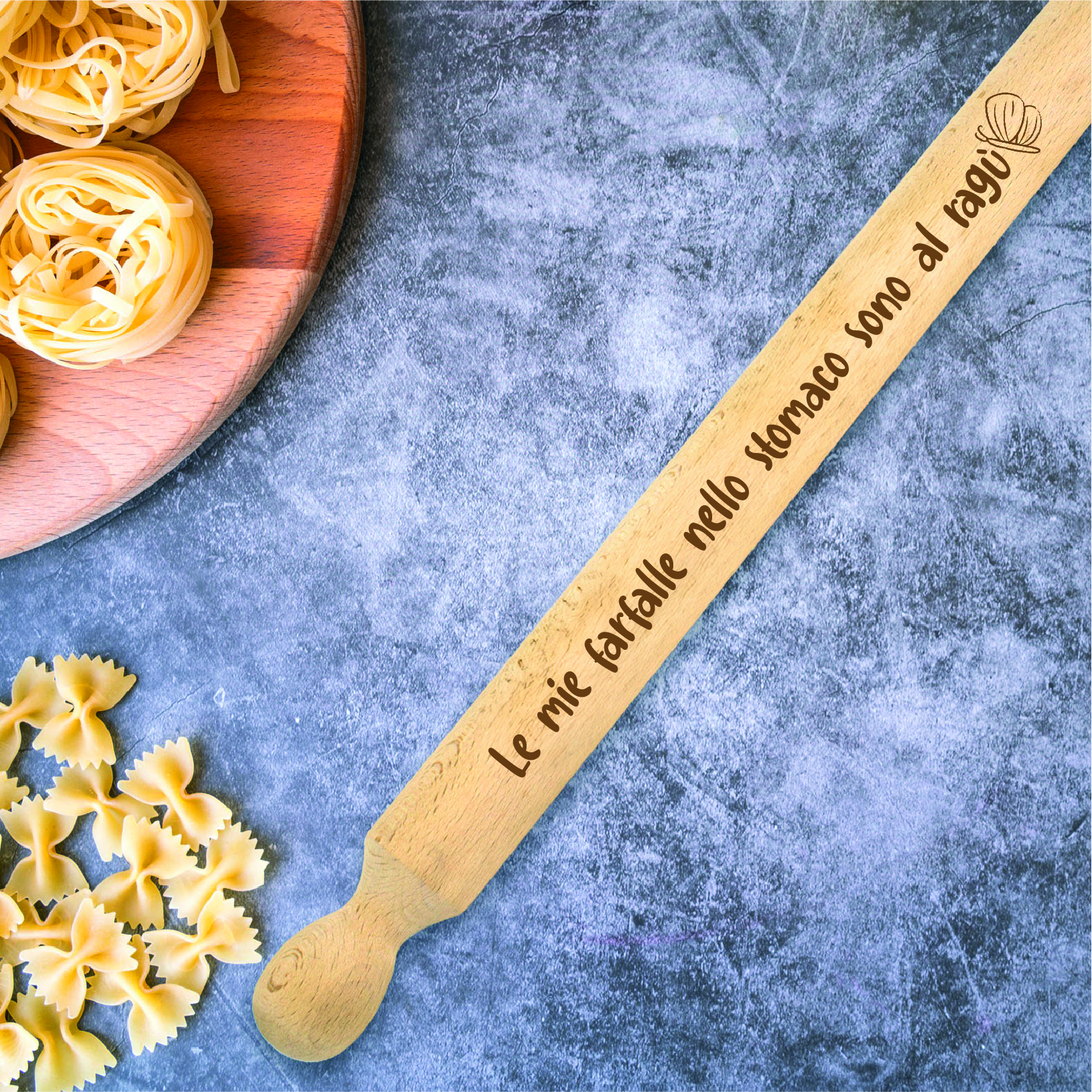 Il Mattarello in legno personalizzato è realizzato in legno e viene lavorato a laser per incidere una bellissima dedica: La mie farfalle nello stomaco sono al ragù.