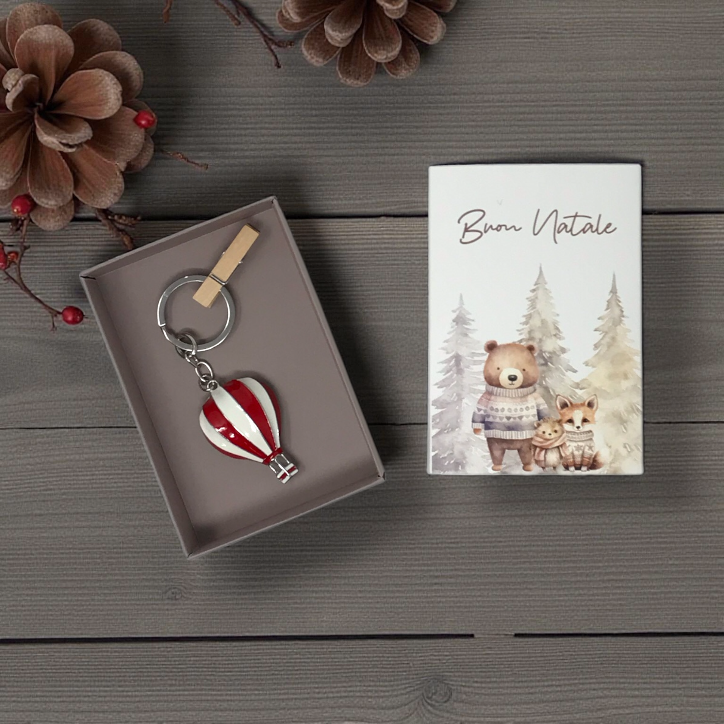 Il portachiavi è racchiuso in un astuccio con grafica natalizia. Misura 8×11.5×2.5 cm