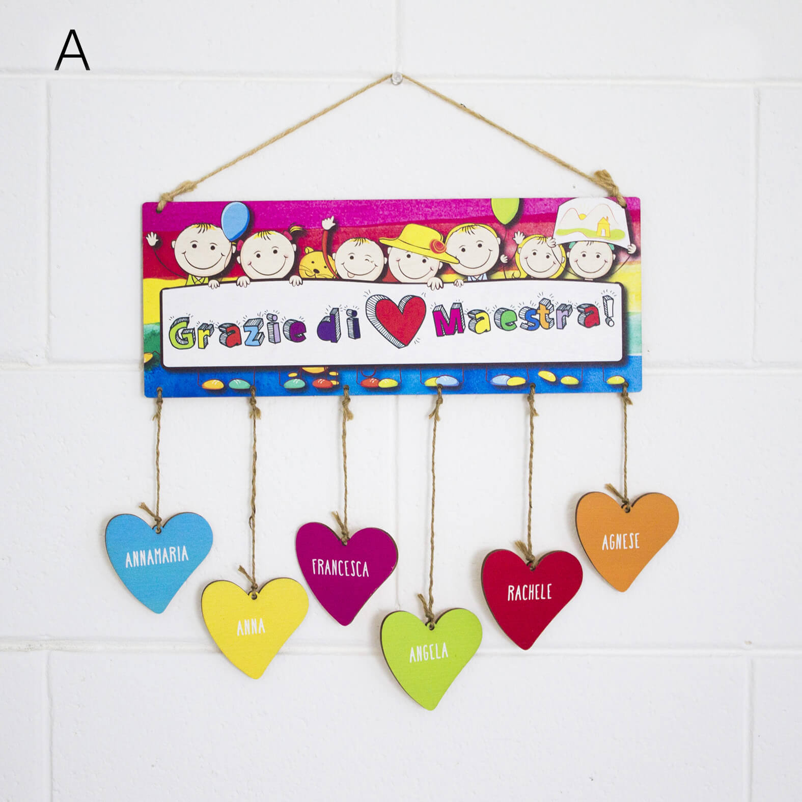 Alla targhetta per le maestre è inoltre possibile appendere dei piccoli pendenti a forma di cuore in diversi colori contenenti i nomi degli alunni della classe.